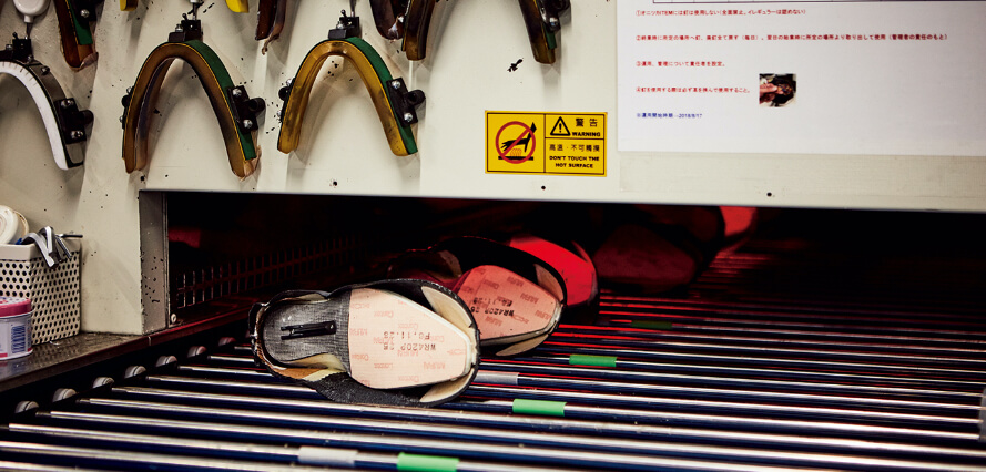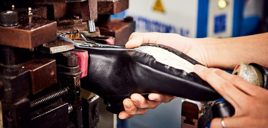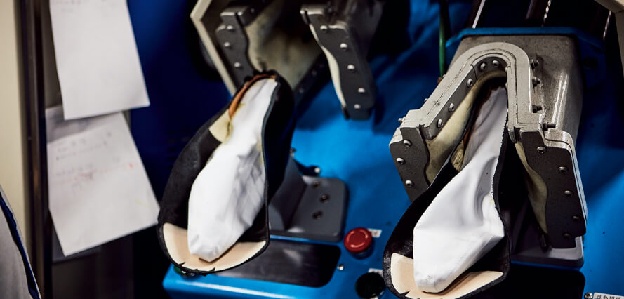 各パーツが揃ったらいよいよ「吊り込み」と呼ばれる組立て工程へ。まずは手作業でアッパーのかかと部分にノリをつけ、機械でしっかりと成形❸。かかと部分の形が整ったらラストを入れてヒーターでノリを乾燥させます❹。その後はつま先の吊り込み作業へ。トゥラスターと呼ばれる機械を使い、つま先部分の革をラストに沿わせる。靴全体のバランスを左右する重要な工程のため、熟練の職人が作業を担当します❺。