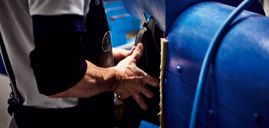 側面の吊り込み作業は、かつてはすべて手作業でしたが現在は機械を使用することも。手作業の場合は「やっとこ」と呼ばれる工具を使って、決められた手順で行います。左右のバランスが崩れないための手順は、アシックスの長い歴史の中で培われたもの❻。かかと部分は「ヒールラスター」を使用して吊り込み。機械で行うことで、難しい湾曲部分も均等に貼り合わせることが可能に❼。加工でできたシワは、熱風を当ててこまめにケア。アッパー底面をサンダーや手バフで削り、吊り込みでできた凹凸をフラットに。この作業の精度でソールの接着力が変わるため、注意深く丁寧に仕上げていきます❽。